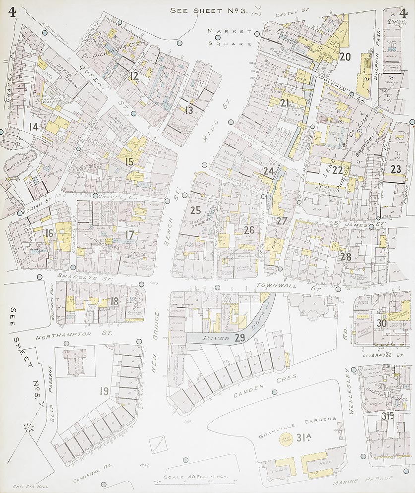 New Street was a notorious place, very rough at times, the whole neighbourhood had a bad name. On the right hand side where is now Gosts[?] shop was the Saracens Head, later an early morning tea shop kept by Mr Lefeuse[?], near where is now the Prince of Orange H.H.[?] was a few steps down to a sunken passage (the bakehouse for the Scotch Bakery being there) then a few steps up into Queens Gardens & thence to Worthingtons Lane, it was only a lane wide enough to let one cart through at a time, it had two public houses, The “Why Not” & the Olive Branch and an entrance to the rear of Rubies’ Store [page 44] at the top left hand corner junction with York Street was Forresters Marine Store Dealer. At the junction of York St & New Street was formerly the Black Ditch.